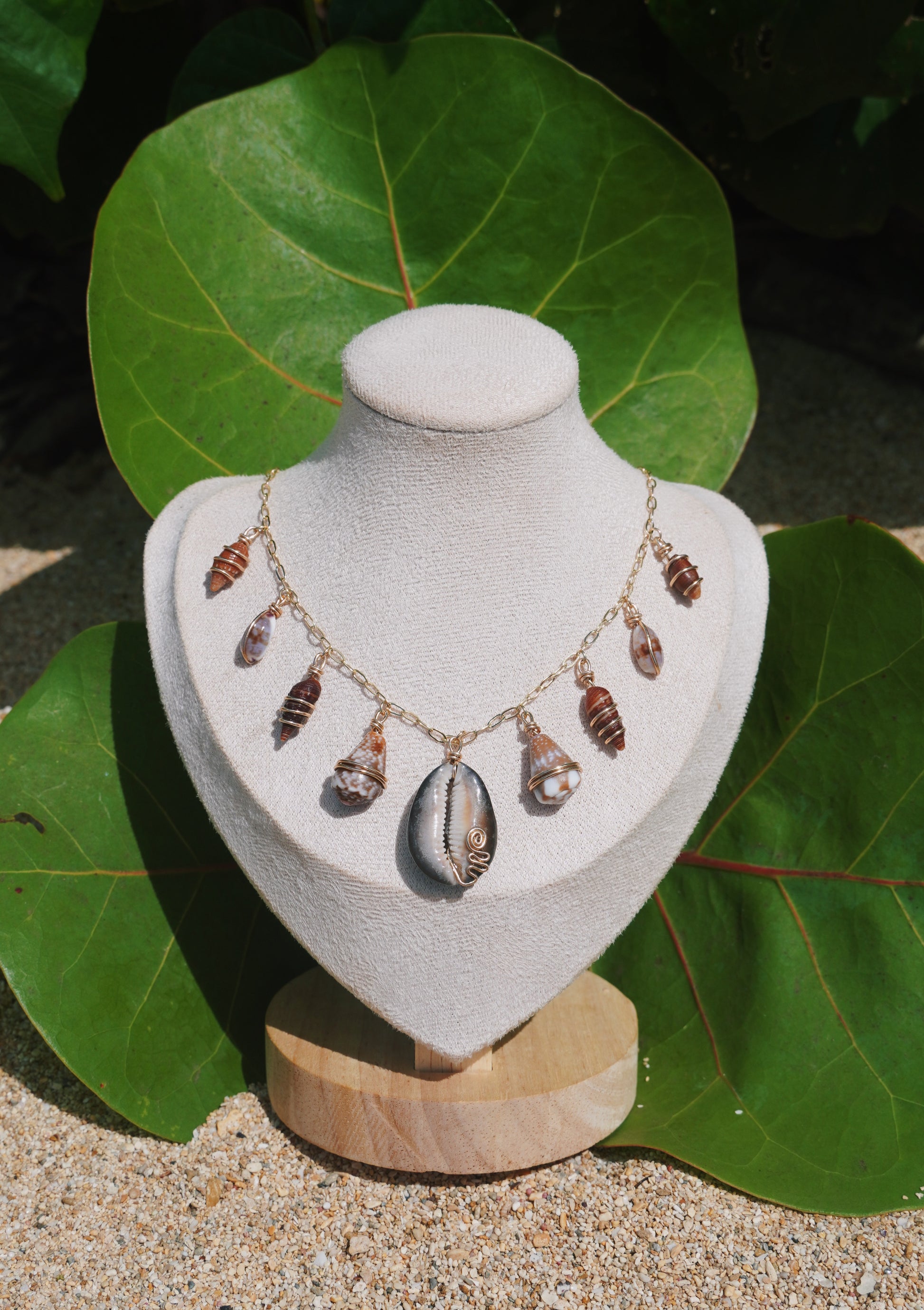 14k Gold Filled Brown Cowrie shell charm necklace paired with Brown Cone shells, Brown Auger shells, and Purple Cowrie shells.