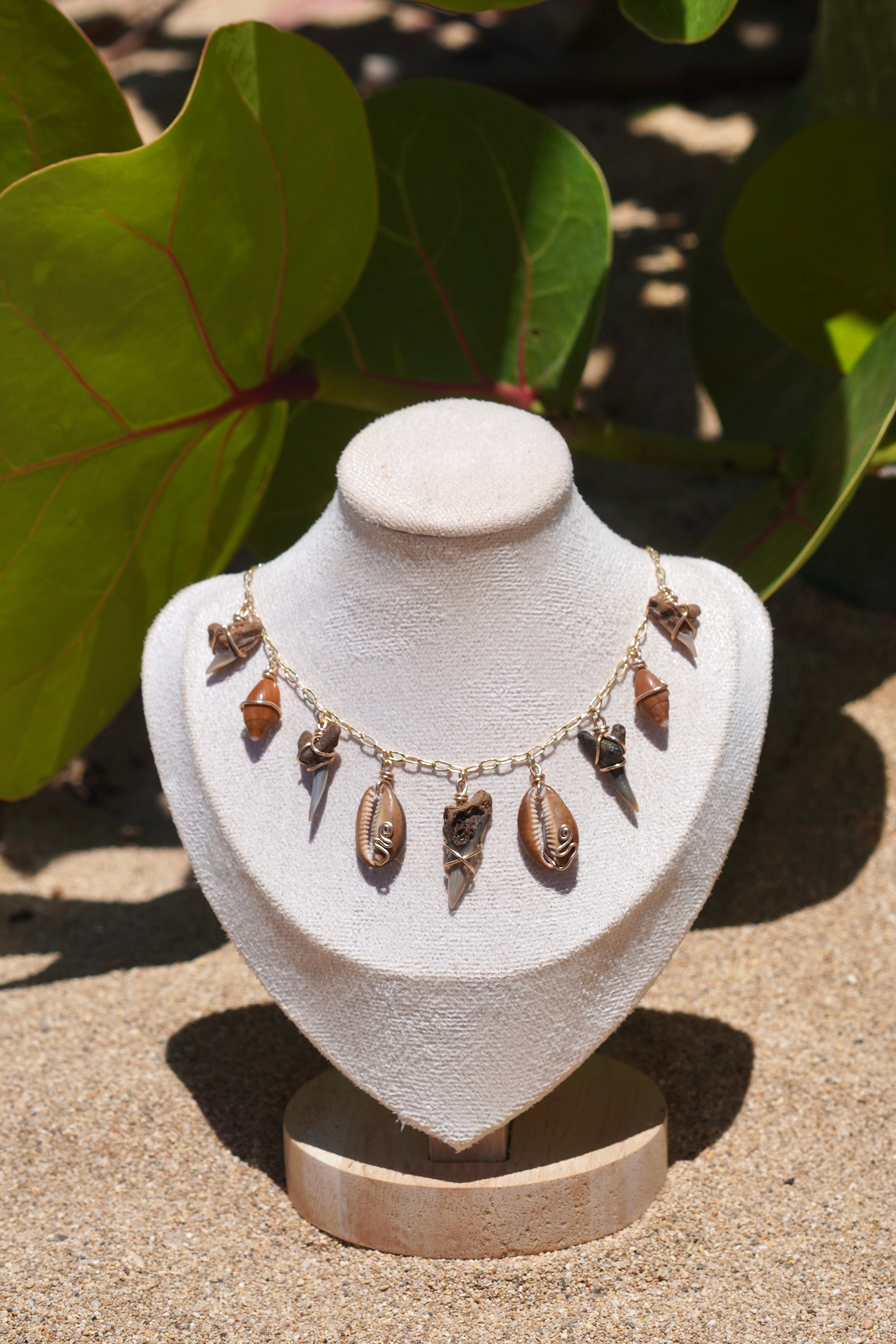 14k Gold Filled Brown Mako shark tooth necklace paired with Brown Cowrie shells, Brown Mako shark teeth, and Brown Nassa shells.