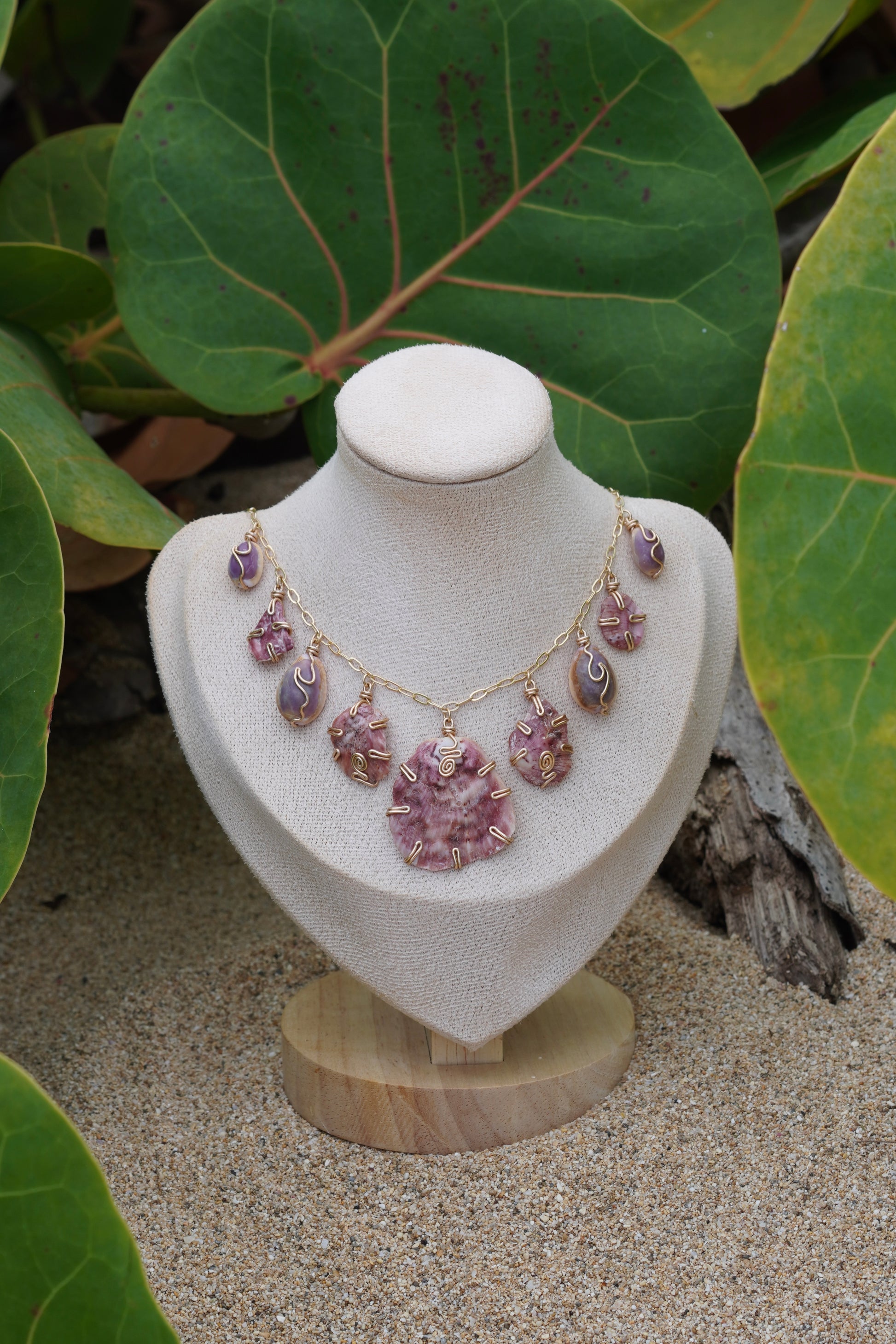 14k Gold Filled Pink Olepe shell charm necklace paired with Purple Honey Cowries and Pink Olepe shells.